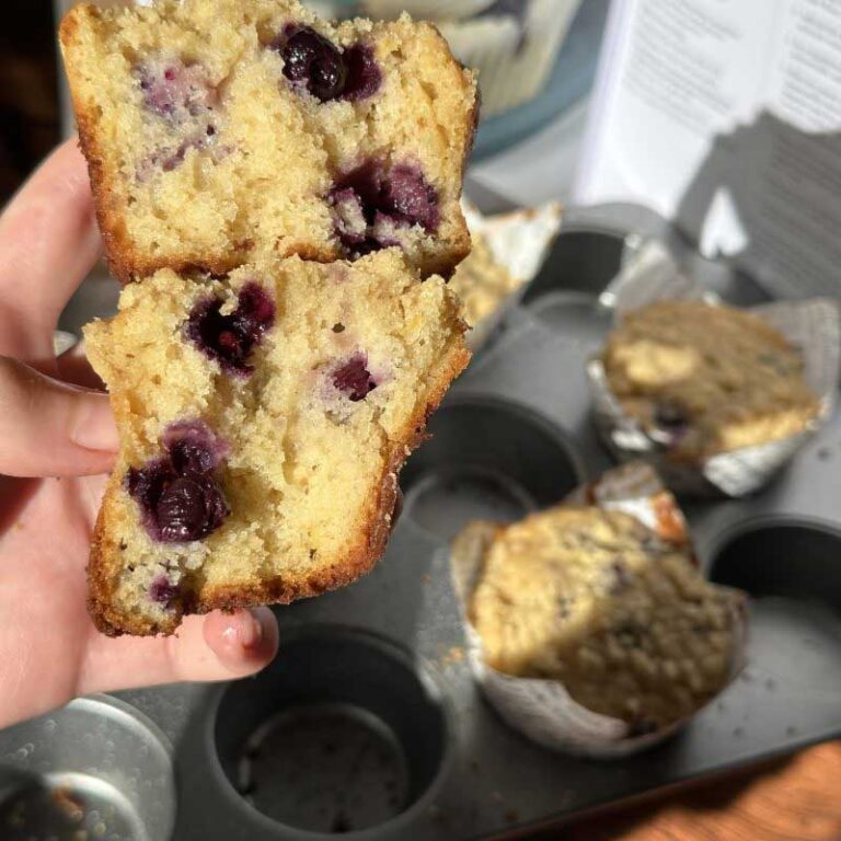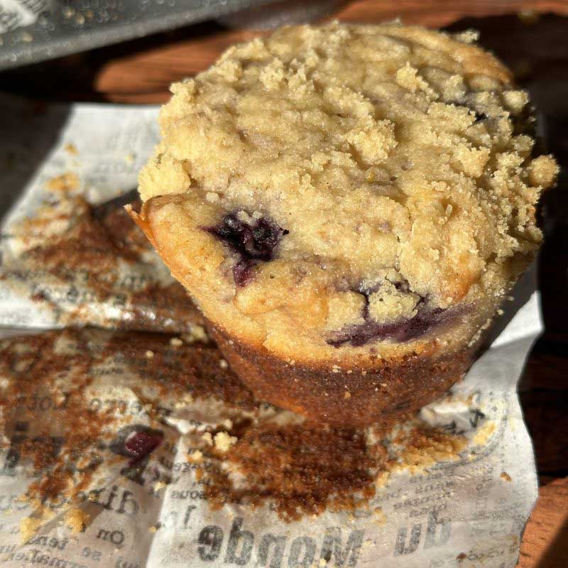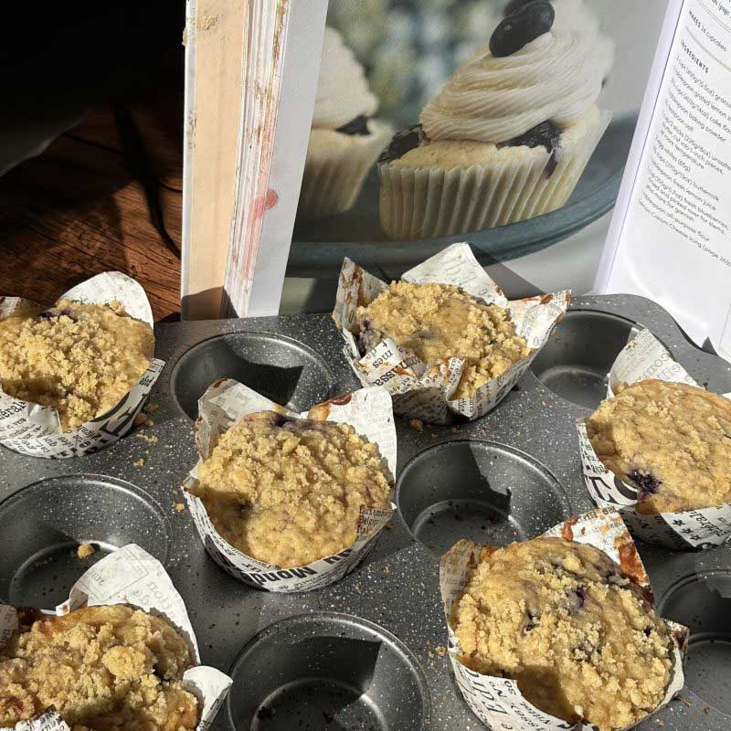 The muffins have a light and tender crumb, featuring a burst of fresh blueberries, adding a juicy sweetness.